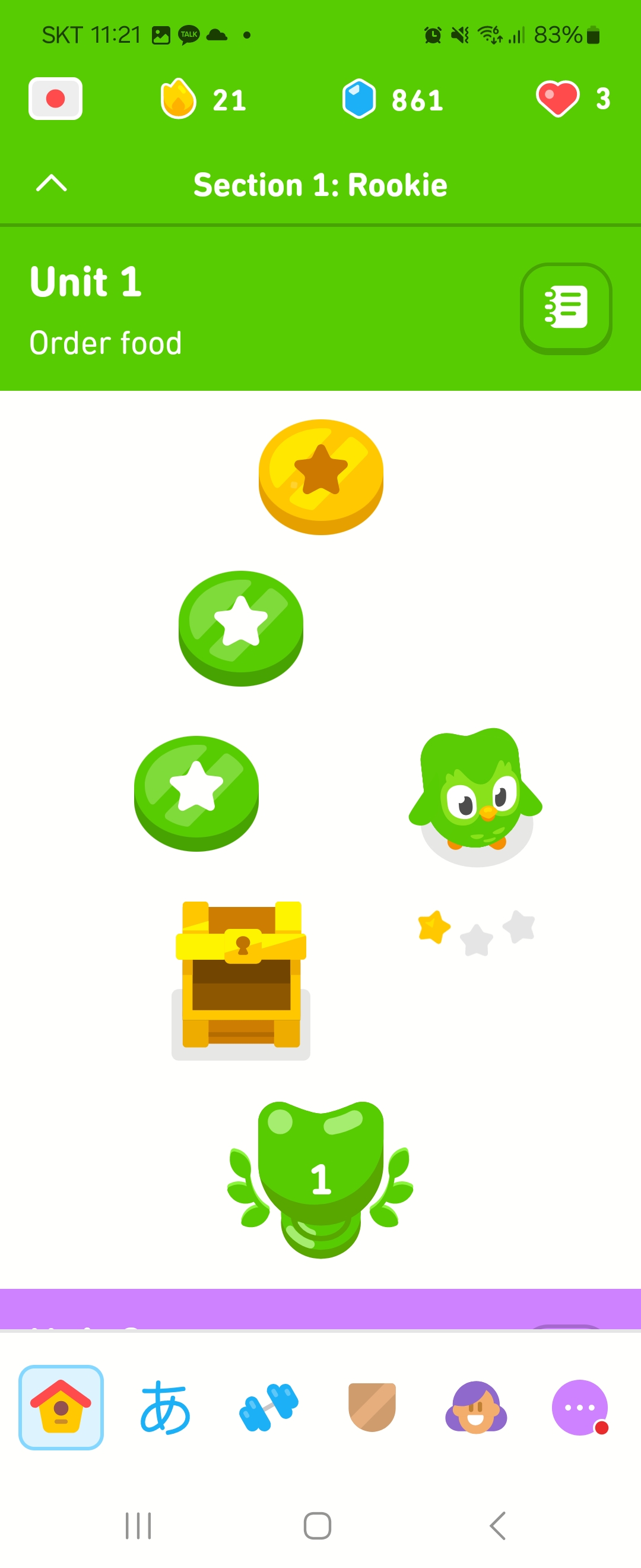 듀오링고의 메인페이지! 이곳에서는 일본 문장들을 배운다. 가장 쉬운 Unit 1에서는 단어 몇 개 (물- みず , 밥- ごはん , 녹차- おちゃ ) 정도와 쿠다사이 ( ください ) 정도로 시작한다.