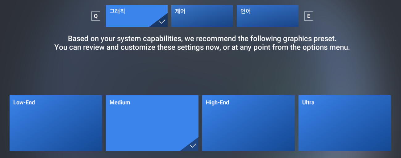 그래픽은 중옵으로 설정했습니다. GPU가 완전 cutting-edge는 아니라서요. 하다가 견디면 high-end로 올려보겠습니다.