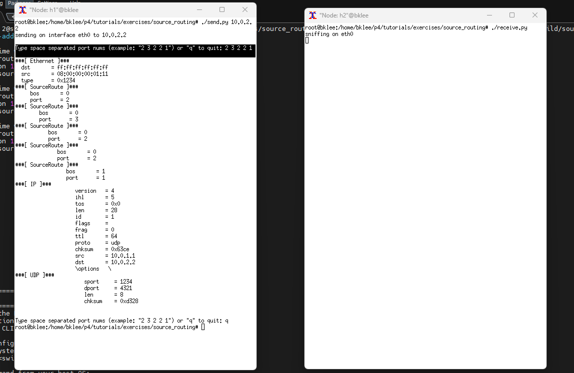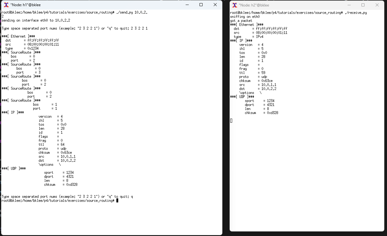 - hdr.srcRoutes[0].port는 15 bits인데 반해, egress_spec은 9 bits입니다. 캐스팅이 없으면 컴파일할 때 에러가 발생하므로, (bit<9>)를 앞에 붙여서 캐스팅해줍시다.