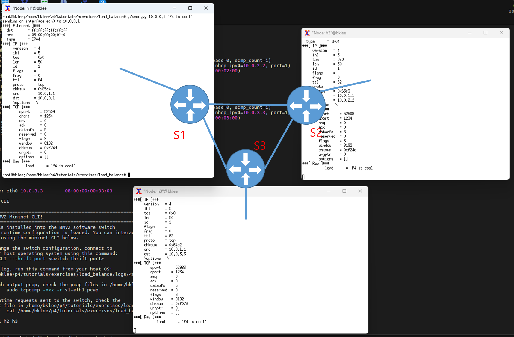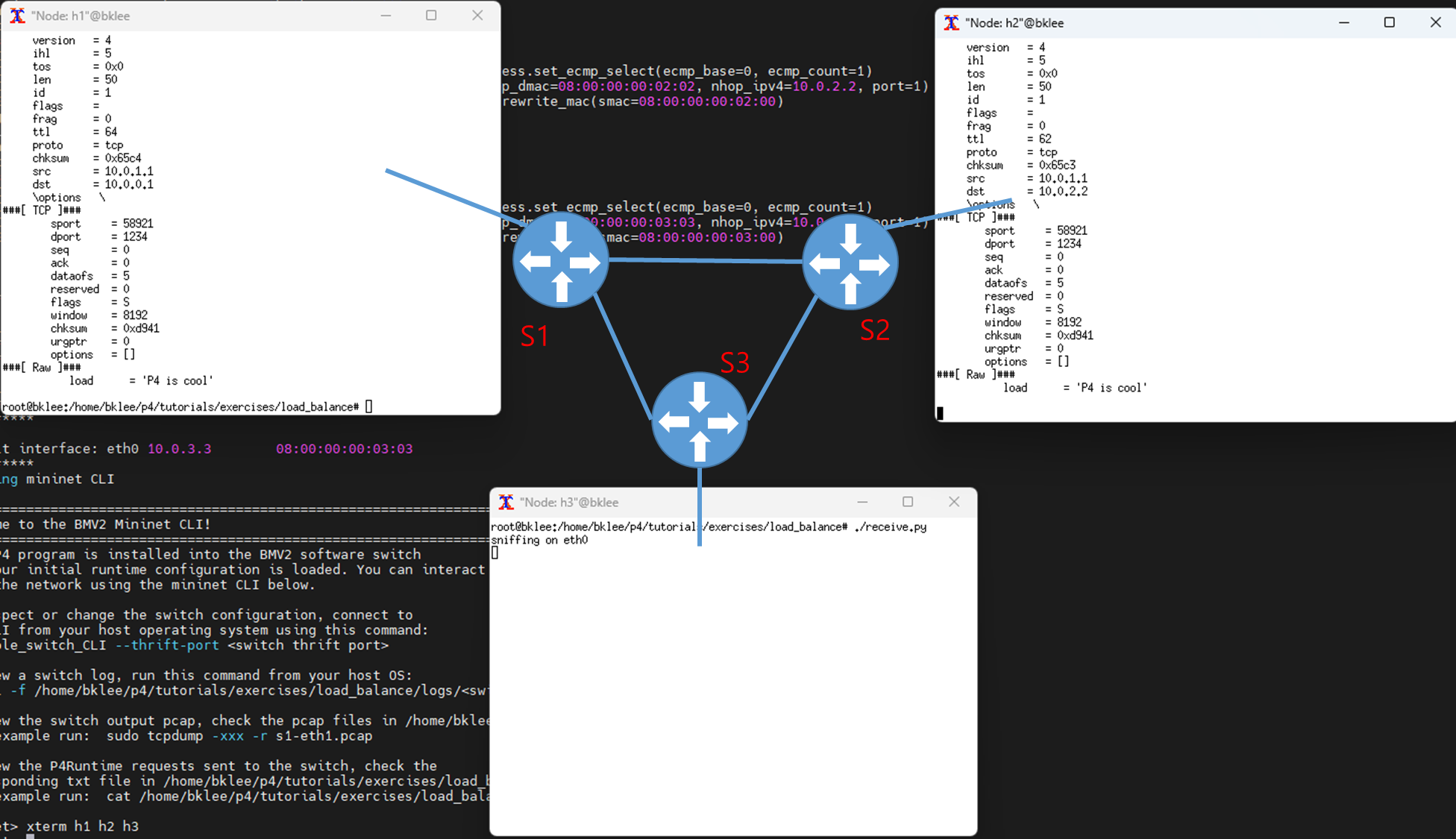 Test run때와 동일하게 실행합니다. 이번에는 send.py를 몇 번 실행하다 보면 h2와 h3에 packet이 모두 잘 도착하는 것을 확인할 수 있습니다.
