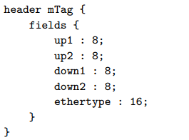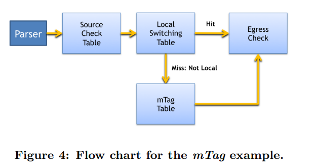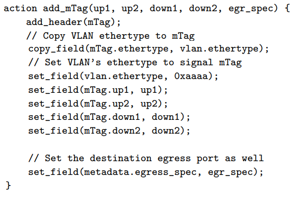 우리의 간단한 예제 mTag에서는 edge 스위치가 L2 destination과 VLAN ID를 매치하고, 헤더에 추가할 mTag를 선택한다. 프로그래머는 이 필드들에 대해 매치를 정의하고 mTag header를 추가할 action을 정의한다.