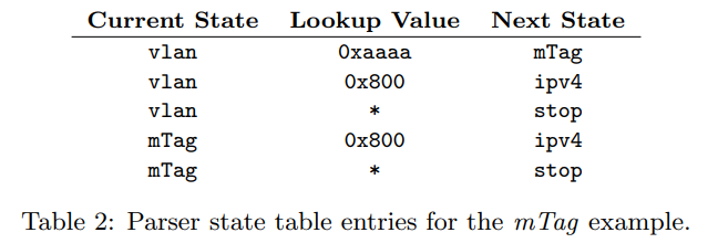 Table 2는 section 4.3의 vlan과 mTag에 대한 상태 테이블 엔트리를 보여준다. 각 엔트리는 현재 상태, match할 field의 값, 그리고 다음 상태를 의미한다. (다른 정보는 여기서는 나타내지 않음)