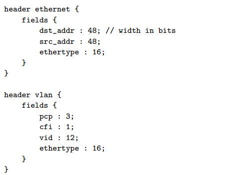 설계는 header format을 정의하는 것으로부터 시작한다. 각 헤더는 ordered list로 정의되며, 이름과 크기(bit)가 명시된다. 추가로, field에 값의 범위에 대한 제약이나, 가변 길이에 대해 최대 값을 지정하는 제약을 걸 수 있다. 예를 들어, 표준 Ethernet과 VLAN 헤더는 다음과 같다.