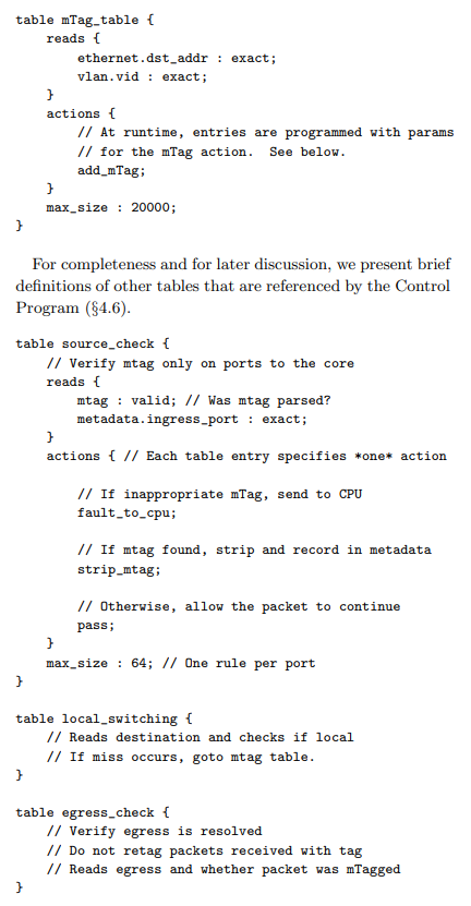 Switches with a few tables: 컴파일러는 많은 양의 P4 table을 물리적으로 공간이 더 작은 table에 매핑할 수 있다. mTag 예제에서는 local 스위칭이 mTag table과 결합될 수 있다. 컨트롤러가 런타임에 새로운 규칙을 추가한다면, 컴파일러의 룰 번역기가 룰을 두 개의 P4 table에 구성하여 하나의 물리적인 table을 생성해낼 수 있다.