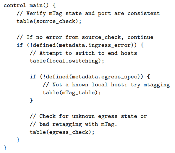 Figure 4는 edge 스위치에서 mTag 구현의 control flow를 그래프 형태로 표현한 것이다. 파싱이 끝나면 soruce_check table에서 수신된 packet과 ingress port 사이에서의 일관성을 검사한다. 예를 들어, mTags는 core 스위치와 연결된 포트에서만 보여야 한다. 또한, source_check는 packet에서 mTags를 떼어냄과 동시에 packet의 metadata에 mTag가 있었는지 여부를 기록한다. 파이프라인에서 그 뒤의 테이블들은 packet을 다시 태깅하는 것을 피하기 위해 이 metadata를 매치해볼 것이다.