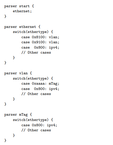 위의 mTag 예제는 parser는 4개의 state만을 갖고 있어 매우 단순하다. 실제 네트워크 세계에서는 백개가 넘는 더 많은 state를 요구할 것이다.