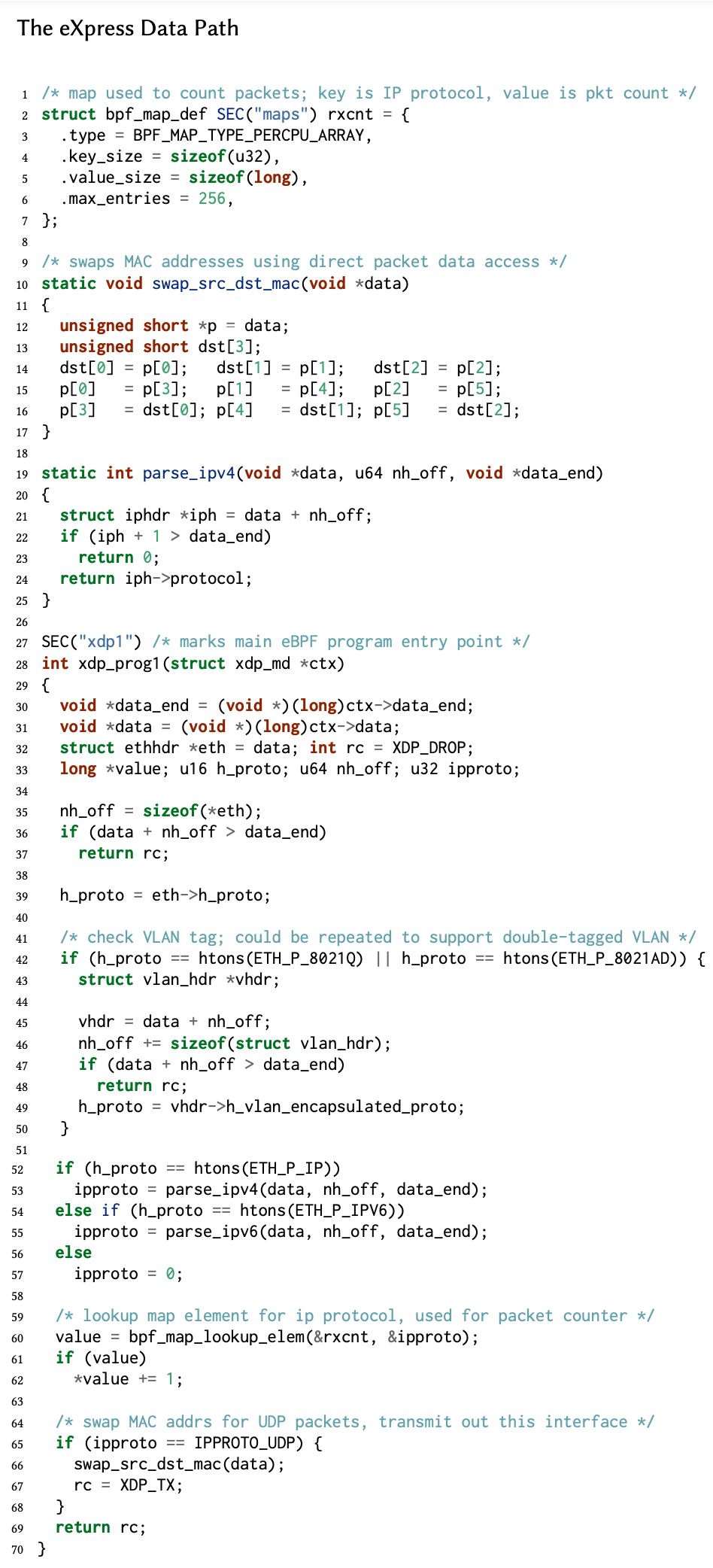 위 코드는 논문에서 예제로 제시한 코드다. Packet header를 분석하고, UDP packet을 source와 mac 주소만 뒤집어서 들어온 interface로 내보내는 작업을 수행한다. 간단한 예제이지만 실 사례에서 많이 사용하는 특징들을 담은 코드이다.