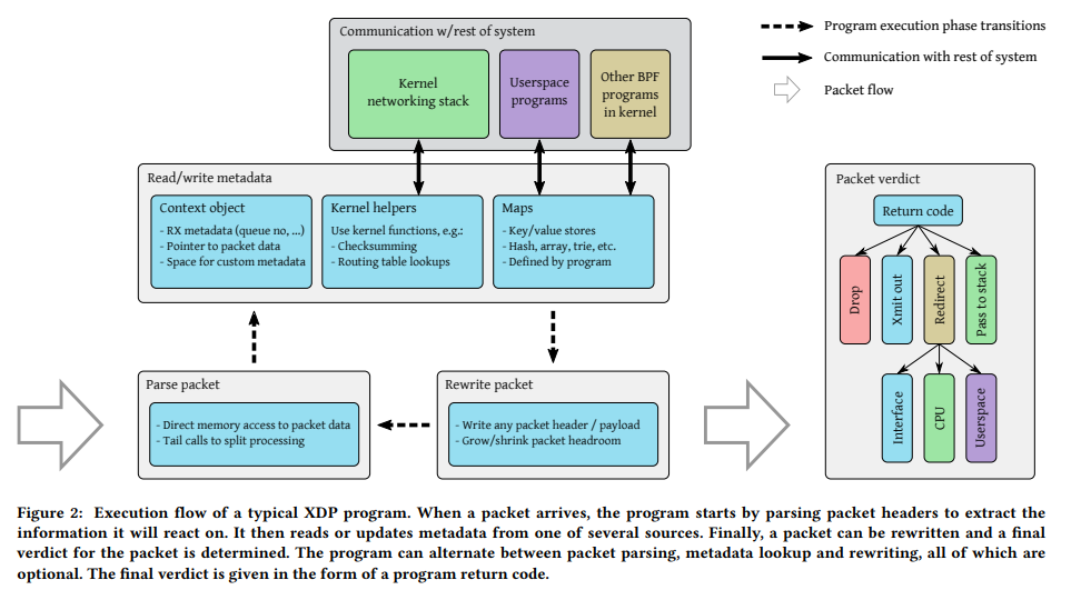 Figure 1은 XDP와 Linux kernel이 어떻게 통합되었는지, Figure 2는 XDP를 이용해 작성된 프로그램이 어떻게 동작하는지 나타낸다. Figure 1의 캡션에 설명되어 있는 것 처럼 packet이 시스템에 도착하면 packet이 건드려지기 전에 device driver의 eBPF 프로그램이 먼저 drop을 할 지 결정할 수 있다. 또는 들어온 interface로 그대로 다시 내보낼지 (redirect), 다른 interface로 보낼지 (forward), 혹은 userspace로 보낼지 (AF_XDP), TC BPF hook을 사용하여 kernel stack 내부를 흐를지 등등을 다양하게 결정할 수 있다. 여러 eBPF 프로그램 및 userspace와도 통신도 가능하다.