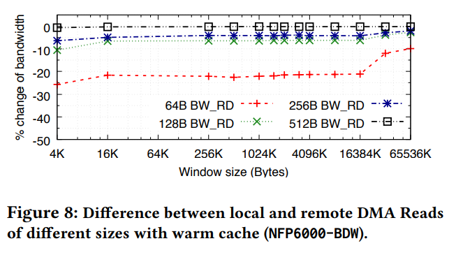 - Figure 8은 Cache warm 상태에서 NUMA Local / Remote에 대한 DMA read bandwidth 성능 차이를 보여준다. ($1 - NUMA\ Remote\ bandwidth\ /\ NUMA\ Local\ bandwidth $) 64 Byte transfer의 경우 NUMA local 대비 NUMA remote가 약 20%의 성능 하락 (32 Gbps -> 25 Gbps)를 보인다. Transfer size가 클수록 성능 하락은 미미하고, 512 Byte 기준으로는 거의 없다고 볼 수 있다.