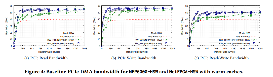 - 다만, 이 결과는 programmable PCIe device에서의 측정보다 약간 정확성이 떨어질 수 있는데, 이는 commodity NIC이 항상 descriptor transfer 오버헤드를 포함하기 때문이다.