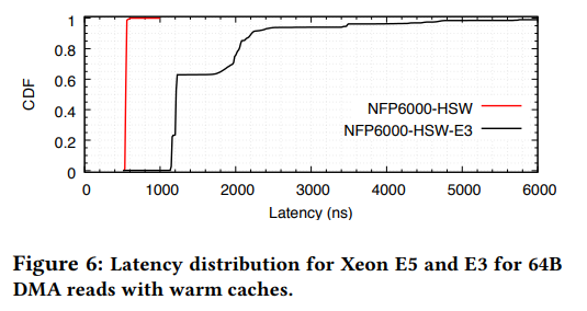 - NFP6000-HSW-E3 (Intel Xeon E3)은 상당히 차이가 심한데, 최소값은 493 ns, 중앙값은 1213 ns, 99th는 5,707 ns 였다. 99.9th percentile은 11,987 ns고, 최대는 5.8 ms였다.