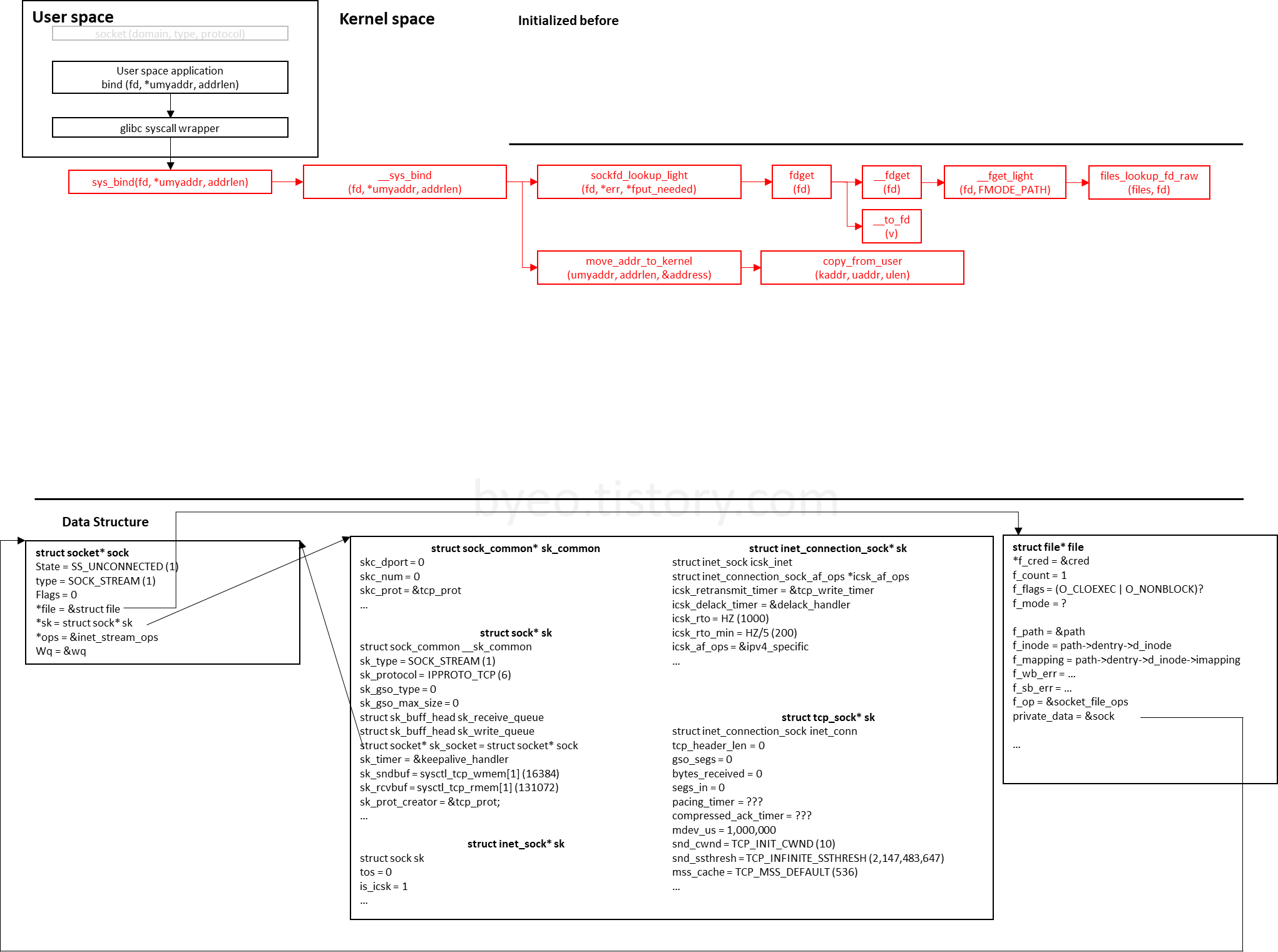 BSD socket API에서 socket을 생성한 뒤에는 server-side 측에서 bind를 실행합니다. bind는 나의 ip:port를 socket과 연결하는 역할을 수행하죠. 이 번에는 BSD socket API중에서 bind를 분석해보려고 합니다.