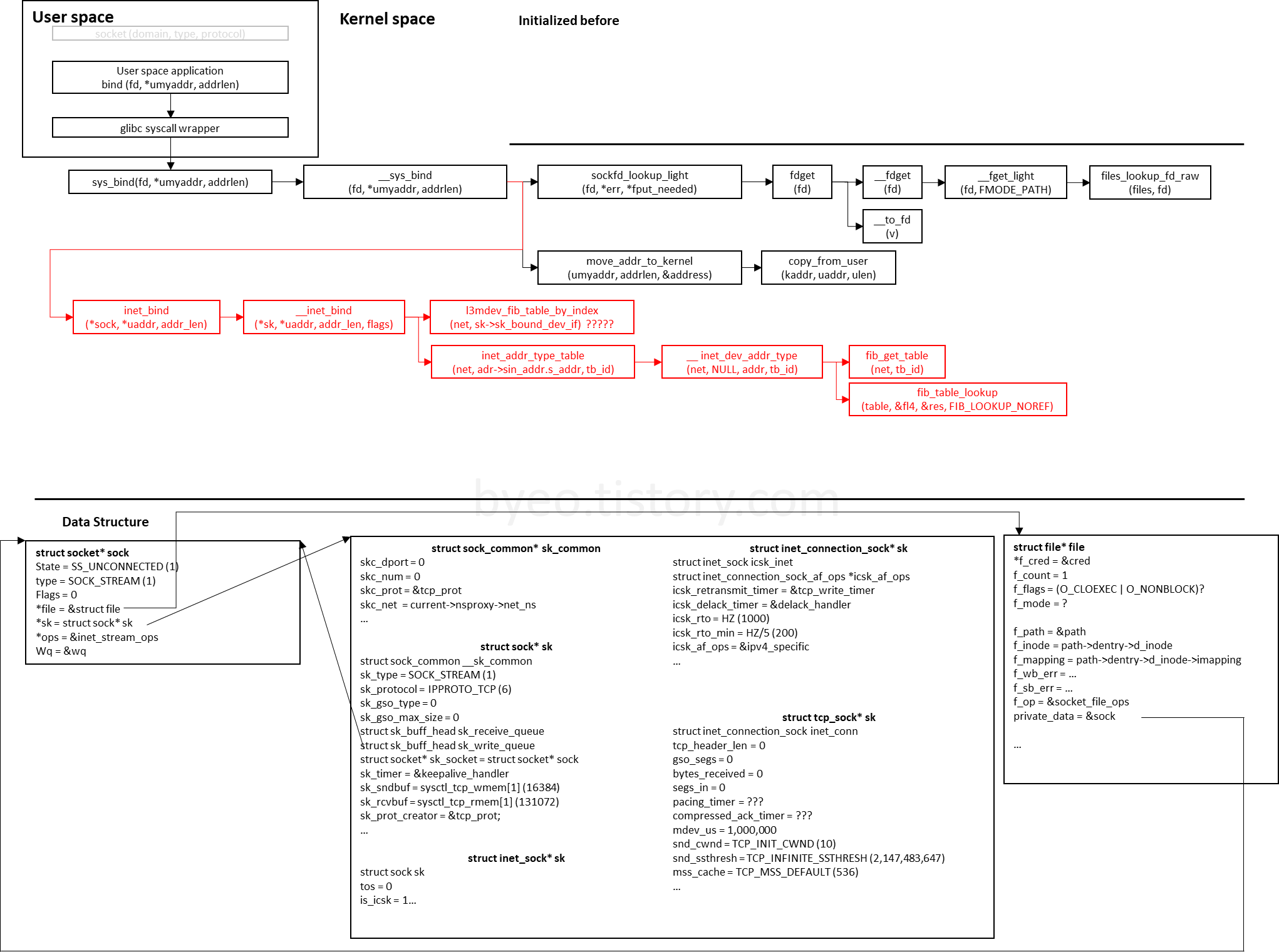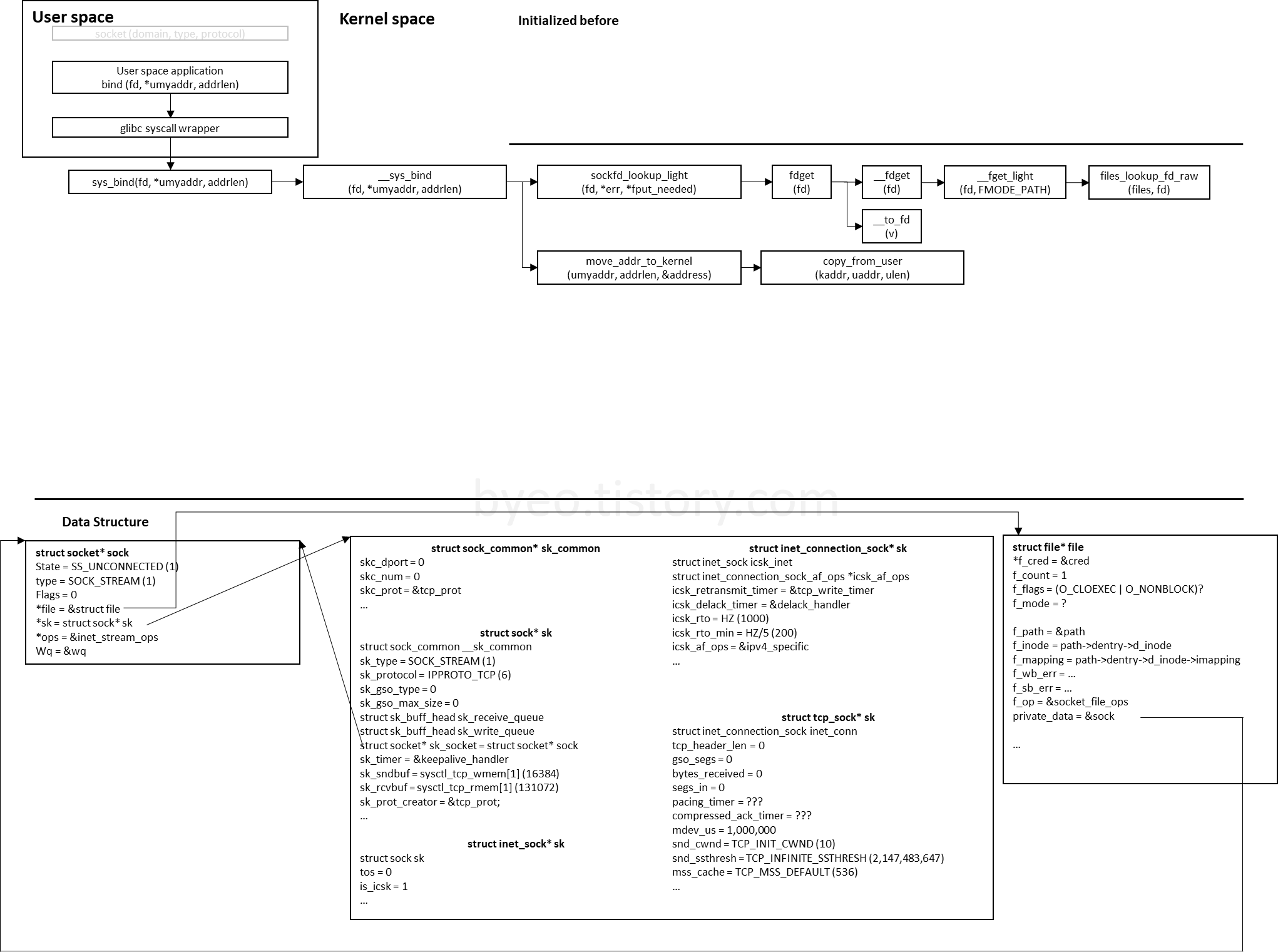 BSD socket API에서 socket을 생성한 뒤에는 server-side 측에서 bind를 실행합니다. bind는 나의 ip:port를 socket과 연결하는 역할을 수행하죠. 이 번에는 BSD socket API중에서 bind를 분석해보려고 합니다. 이전